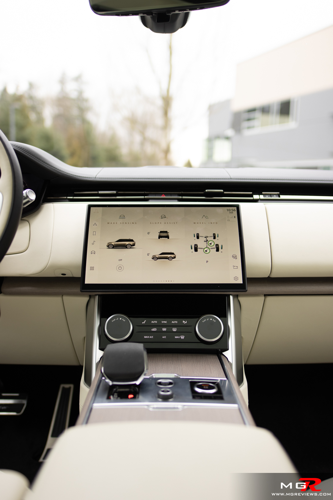 Off roads, the Range Rover has standard Terrain Response 2 programs that can alter the performance of the center and rear locking differentials, the traction & stability control systems, the transmission shifts and engine response, and the air suspension. The different modes are Grass/Gravel/Snow, Mud/Ruts, Sand, Rock crawl, water wading (which can wade in up to 900 mm or 35.4 inches of water) and a configurable mode that allows you to change certain parameters such as differential lock, powertrain response, traction control, and so on. In the maximum off-road ride height, the Range Rover has 295 mm or 11.6-in of ground clearance, 34.7° approach angle, 29° departure angle, and 27.7° breakover angle. Unfortunately I did not get a chance to take the Range Rover on some trails because I was not confident enough in taking a $200,000 CAD large SUV like this deep in the woods. Can you imagine what the cost would be to buff out paint scratches from branches?